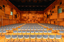 音響・照明設備の整ったホール。300席規模の平平土間。